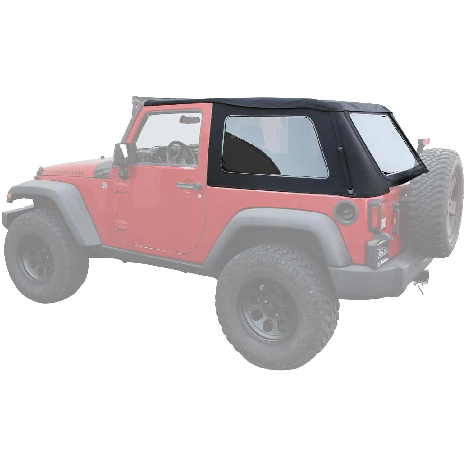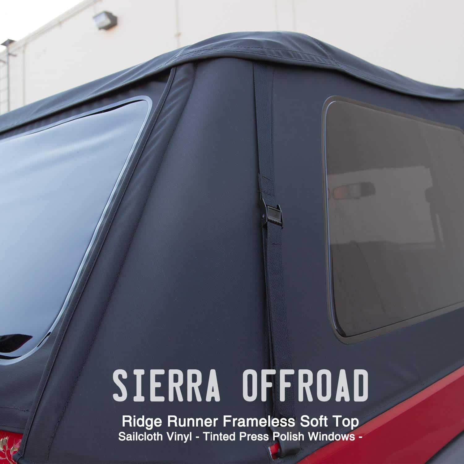 Give your 2007-2018 2 door Jeep Wrangler a new look with this replacement black sailcloth soft top made by Sierra Offroad. Our Ridge Runner Frameless Jeep Soft Top for the JK Wrangler includes tinted heavier 40 mil press polish windows for superior visibility and longer life. Windshield channel and Tailgate Tonneau bar kit is required for all models. Door surround kit is required for JK hard top models only.